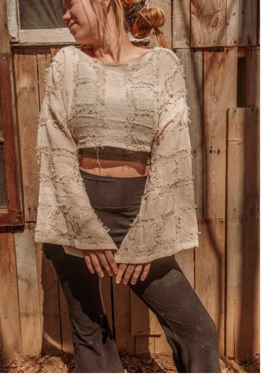 Grunge Boho Style Bell Sleeve Crop Top, Mesh Summer Top